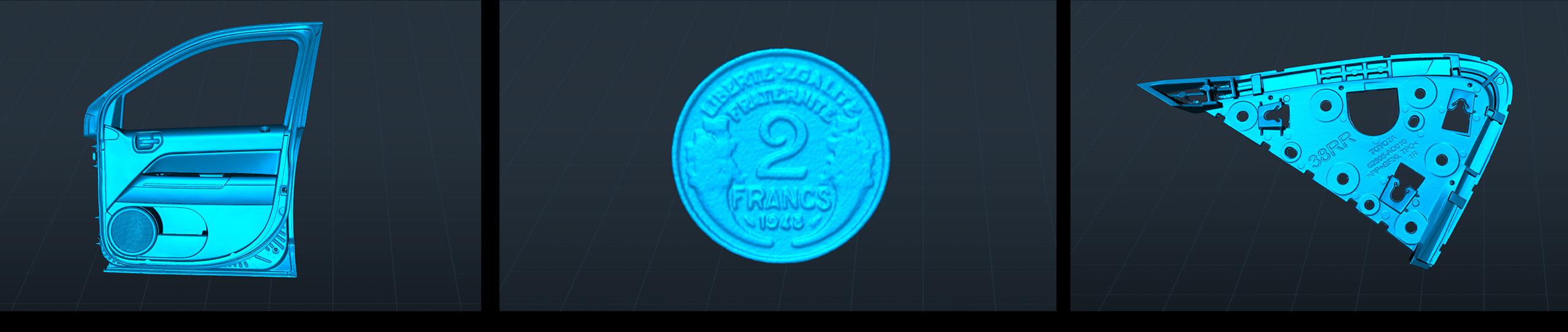 Скенерът покрива широк диапазон на обектите за сканиране – от 5 x 5 x 5 mm до 2000 x 2000 x 2000 mm, което го прави универсално решение както за миниатюрни детайли, така и за значително по-големи елементи. Работното разстояние е 150 – 400 mm в син лазерен режим и 170 – 1200 mm в NIR режим.