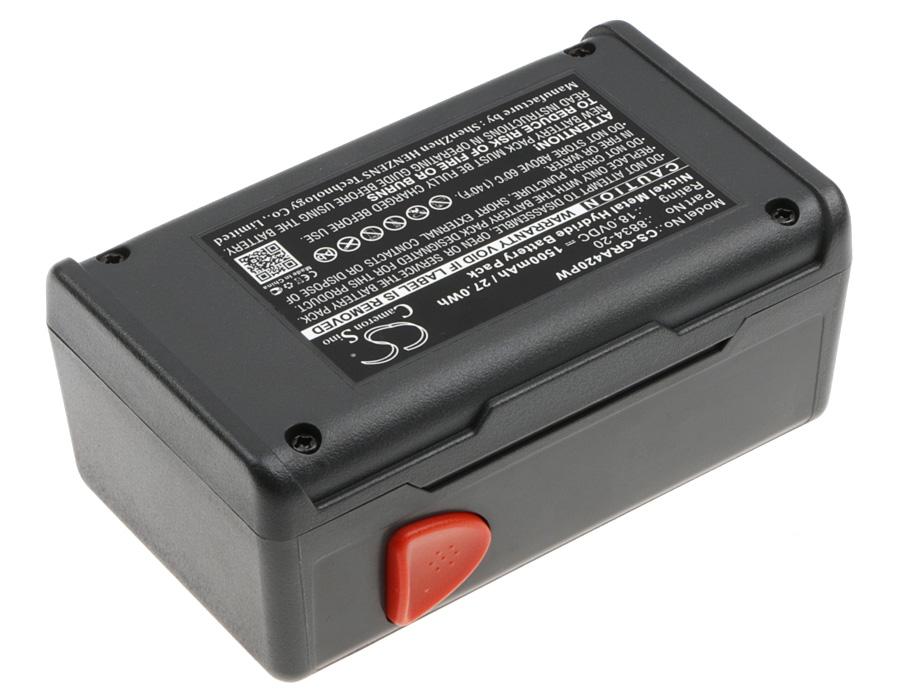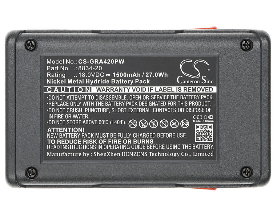 Item No.:CS-GRA420PW Type:Ni-MH Capacity:1500mAh / 27.00Wh Voltage:18.0V Color:Grey Dimension:125.10 x 80.16 x 53.00mm EAN Code:4894128113522 Net Weight:489.0g / 17.25oz ТЕХНИЧЕСКИ ДЕТАЙЛИ Тип аксесоар Акумулатор Химически състав Lithium Волтаж 18 V Капацитет 1500 mAh