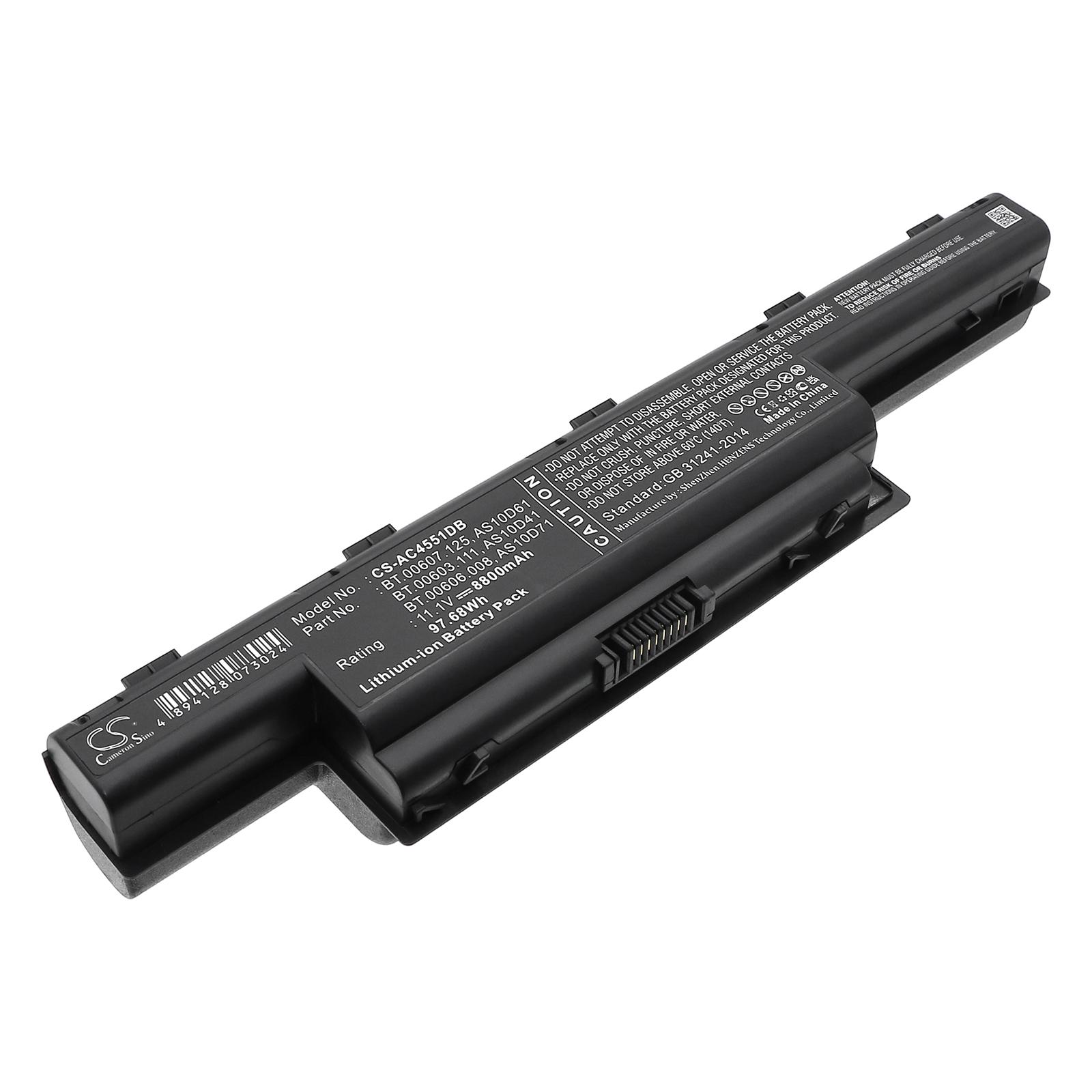 Item No.:CS-AC4551DB Type:Li-ion Capacity:8800 mAh / 97.68 Wh Voltage:11.1 V Color:Black Dimension:269.80 x 54.40 x 42.00mm EAN Code:4894128073024 Net Weight:605 g /21.34 oz ТЕХНИЧЕСКИ ДЕТАЙЛИ Марка лаптоп Acer Напрежение (V) 11.1 V Капацитет (mAh) 8800 mAh Химически състав Lithium-Ion Брой клетки 9 Цвят Черен