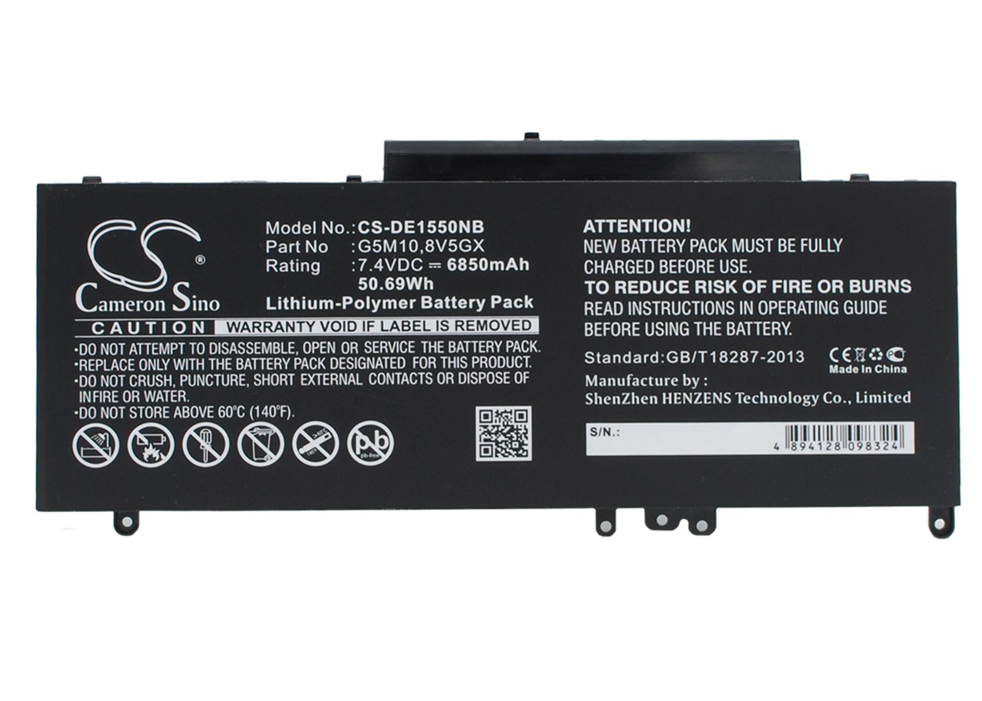 Item No.:CS-DE1550NB Type:Li-Polymer Capacity:6850 mAh / 50.69 Wh Voltage:7.4 V Color:Black Dimension:233.08 x 103.50 x 7.32mm EAN Code:4894128098324 Net Weight:251.6 g /8.87 oz ТЕХНИЧЕСКИ ДЕТАЙЛИ Марка лаптоп Dell Напрежение (V) 7.4 V Капацитет (mAh) 6850mAh Химически състав Lithium-Polymer Брой клетки 6 Цвят Черен