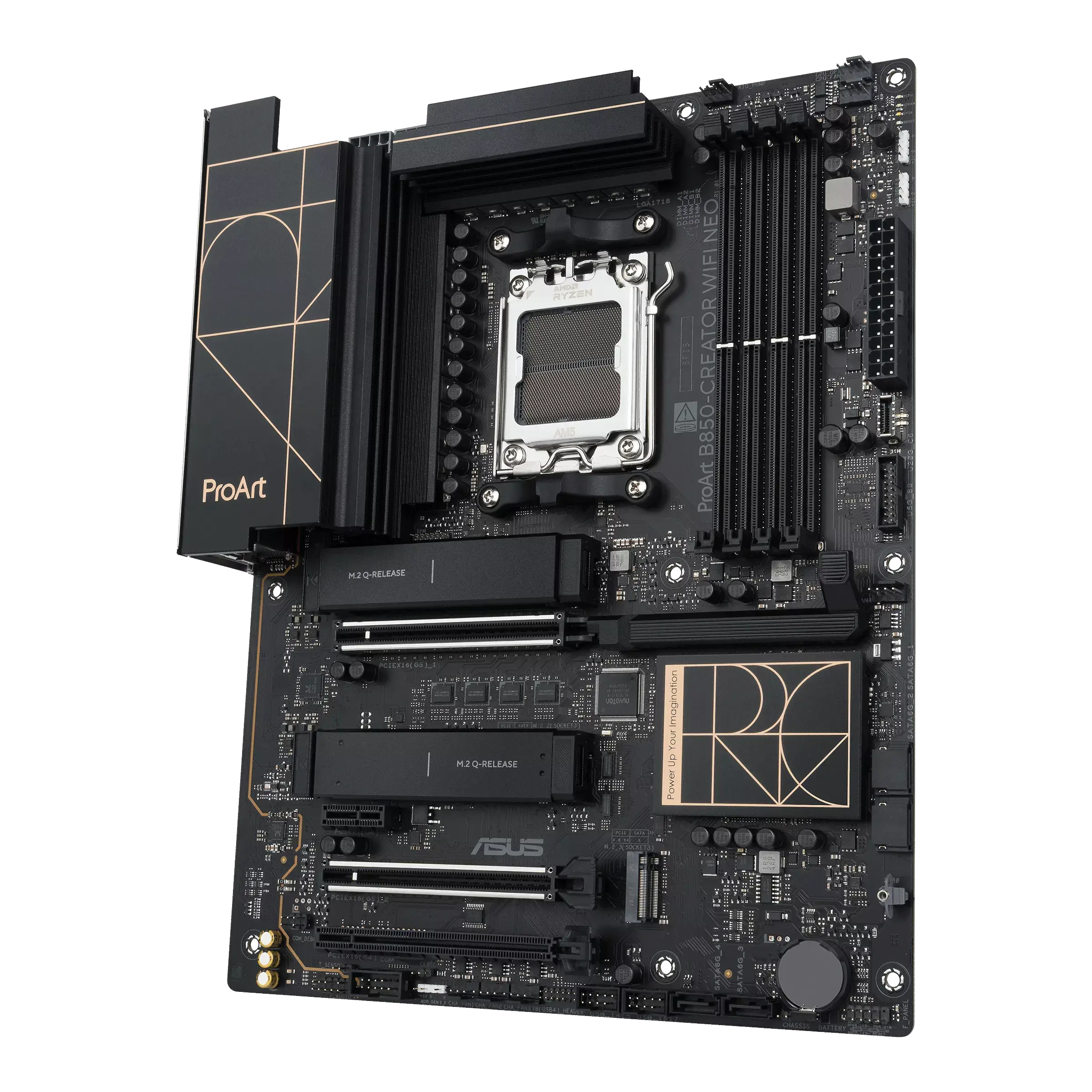 ASUS ProArt B850‑CREATOR WIFI NEO е висококласна AM5 дънна платка, създадена за творци, които се нуждаят от мощност, бърза свързаност и богати възможности за разширение, комбинирайки PCIe 5.0, DDR5, Wi‑Fi 7 и двойна 5GbE мрежа в изчистен професионален дизайн.