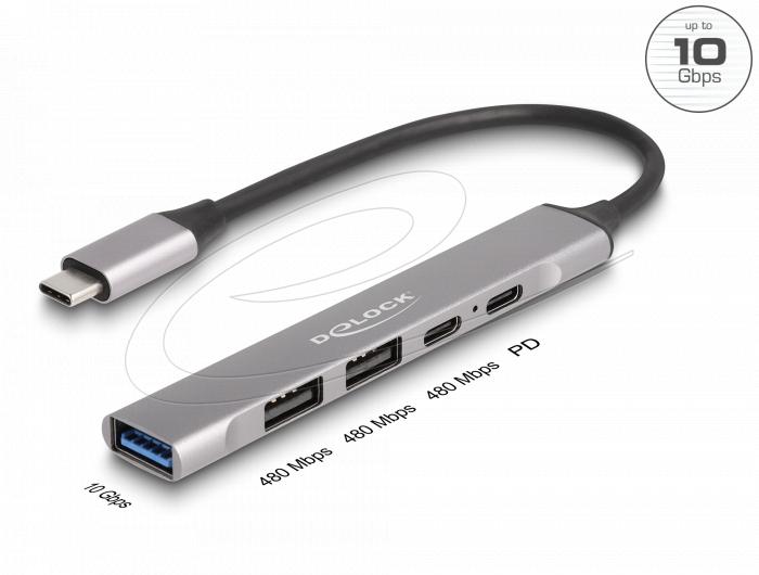 Delock Хъб USB-C, 4 порта, 1 x USB-A 10 Gbps, 2 x USB-A, 1 x USB-C, USB-C PD 95 W