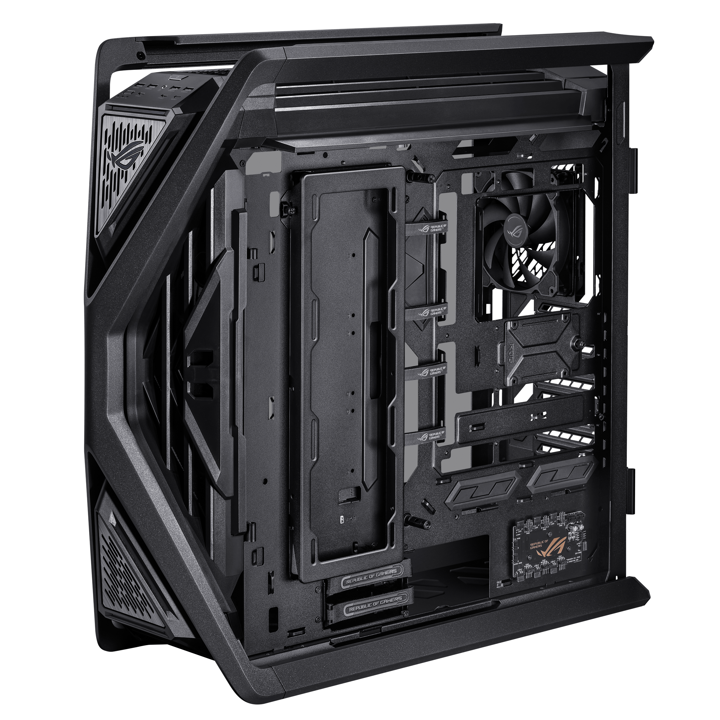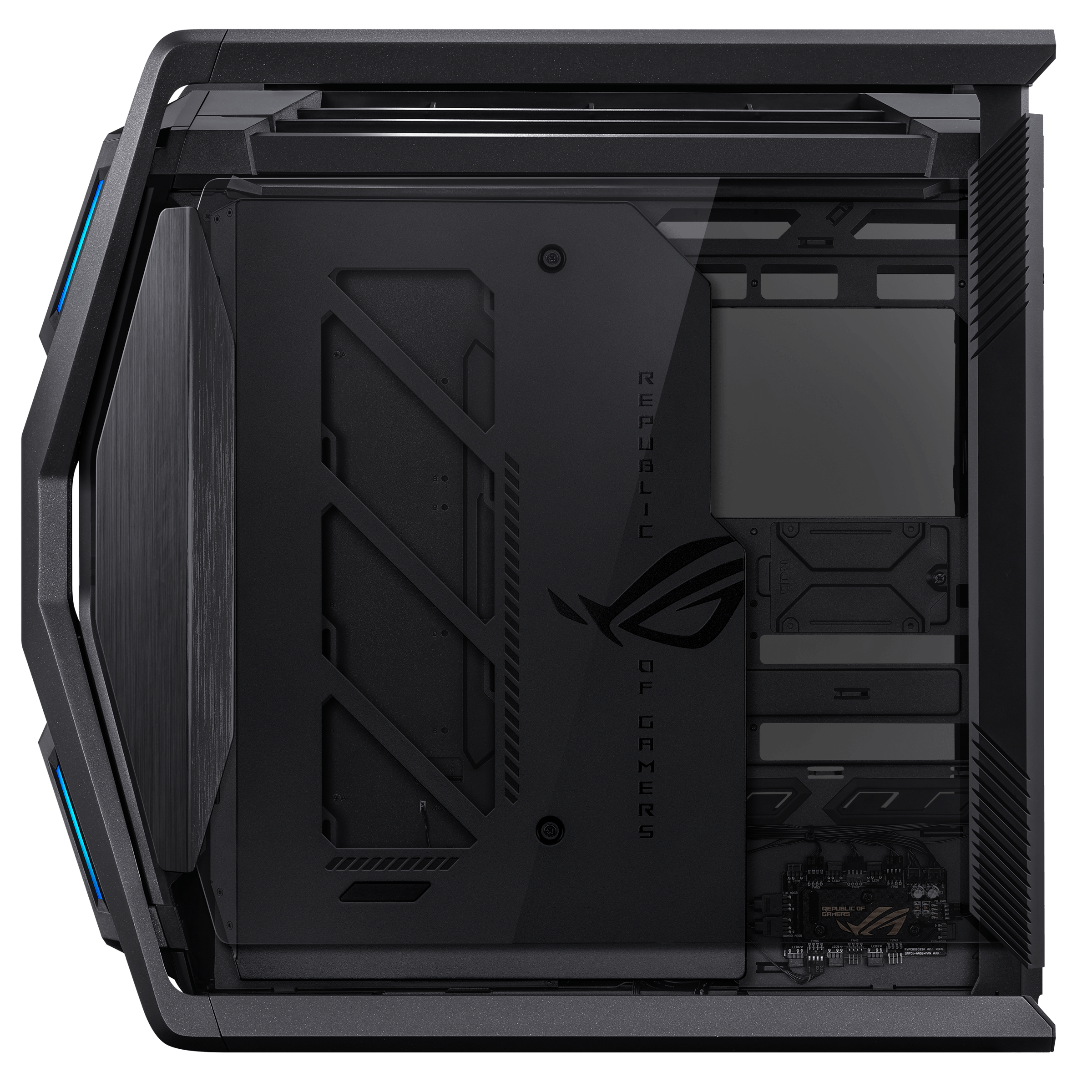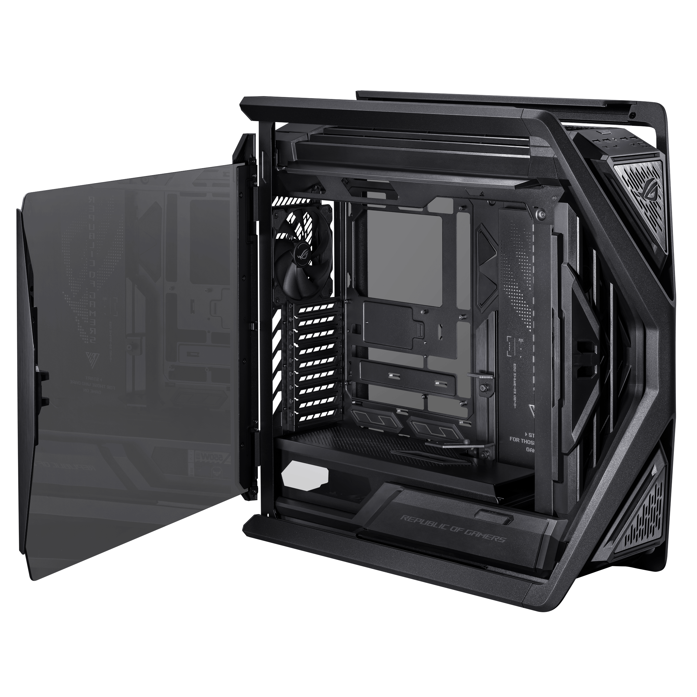 ROG Hyperion GR701 BTF Edition е висококласна геймърска компютърна кутия, създадена за максимално охлаждане, управление на кабелите и премиум дизайн. Отличава се с скрити конектори на дънната платка, което позволява чист и подреден външен вид.