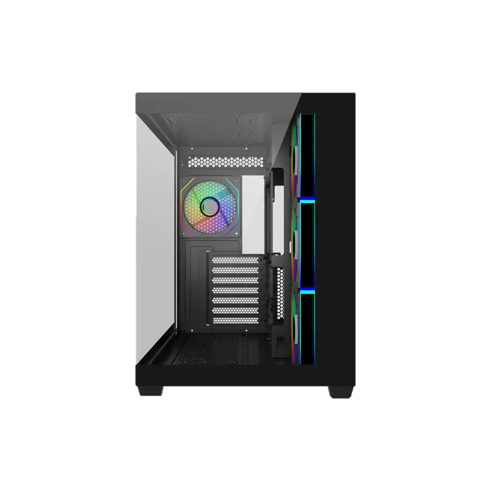 - Панорамен стъклен дизайн – Две закалени стъклени панели с 45° фаски осигуряват почти непрекъснат 270° изглед към компонентите и RGB осветлението.