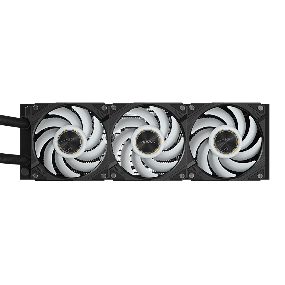 - Водният блок и вентилаторът разполагат с градиентно осветление, а ARGB осветлението на вентилатора може да се синхронизира с други AORUS устройства чрез GCC (GIGABYTE Control Center).